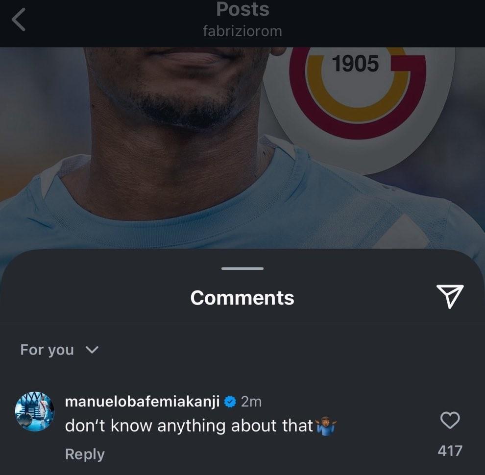 结果,阿坎吉本人在罗马诺的这条动态下评论“我怎么对此一无所知”并配了一个“不知道”的表情,随后,罗马诺删除了有关这一消息的动态。